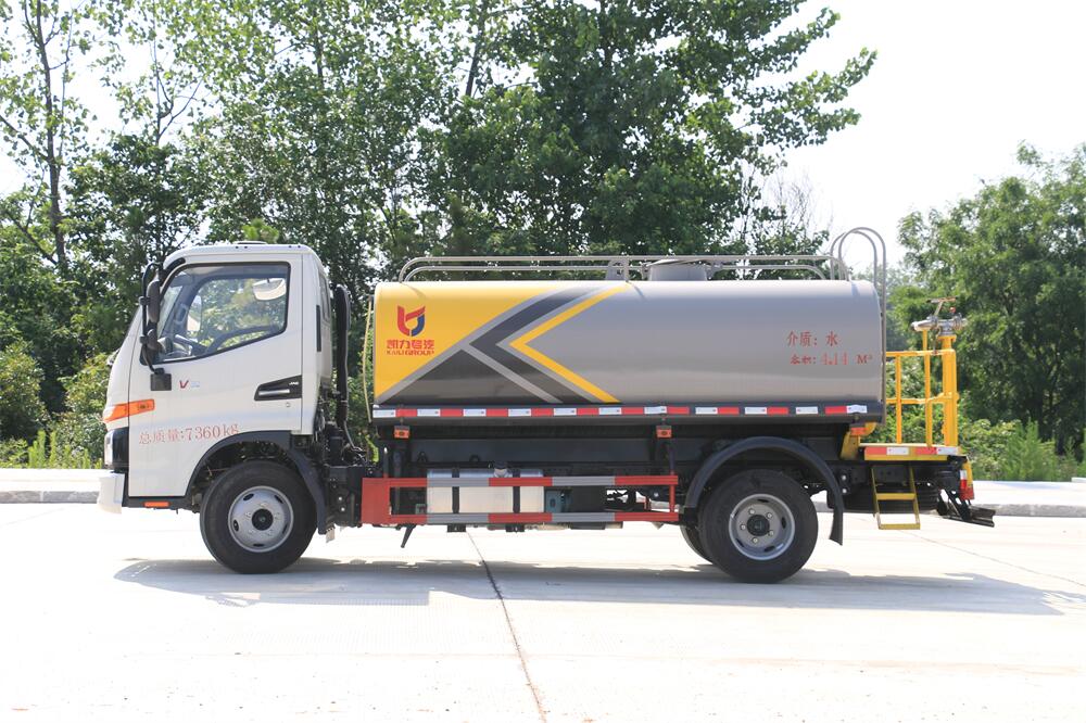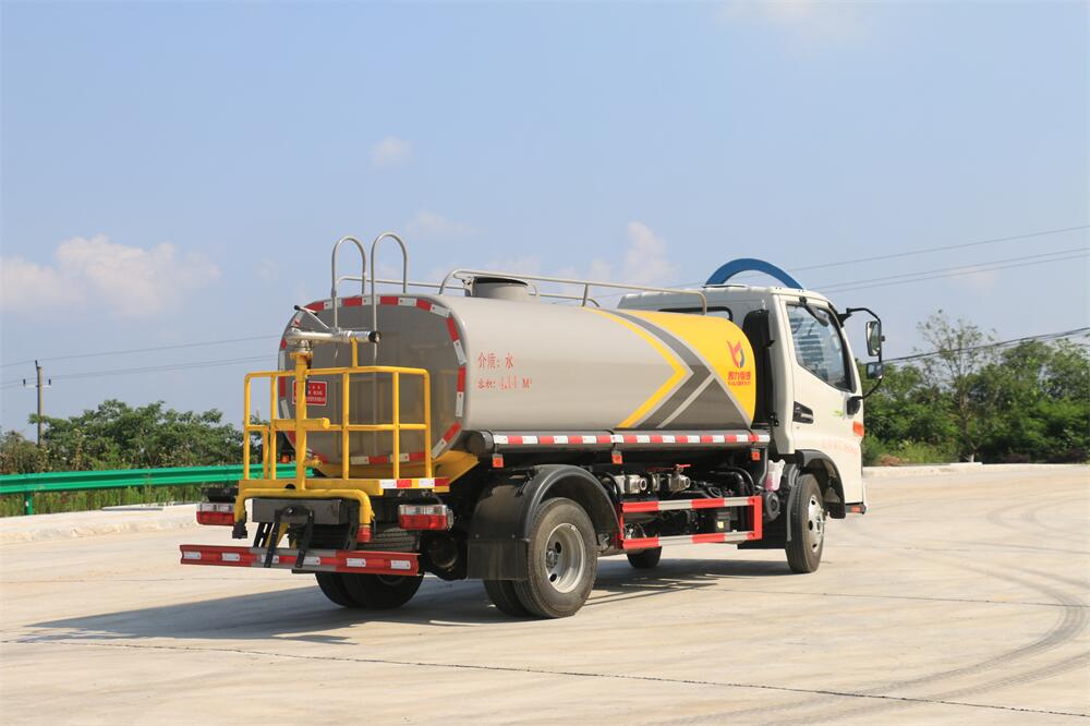 灑水車(chē)前裝有鴨形噴嘴或圓頭沖嘴,后面裝有圓柱開(kāi)灑水噴嘴或蓮蓬頭噴嘴,后部有一工作平臺(tái),裝配有水炮。后部還可裝8個(gè)噴嘴(選裝)。