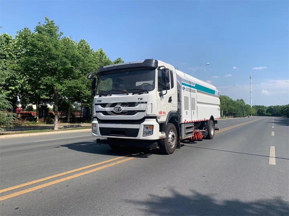 1)該車集掃路車和高壓清洗車功能于一體,具備路面清掃、路面洗刷、高壓清洗、路緣石洗刷、垃圾收集、污水回收、噴霧降塵和道路隔離墻清洗、小廣告清洗等多種作業功能。