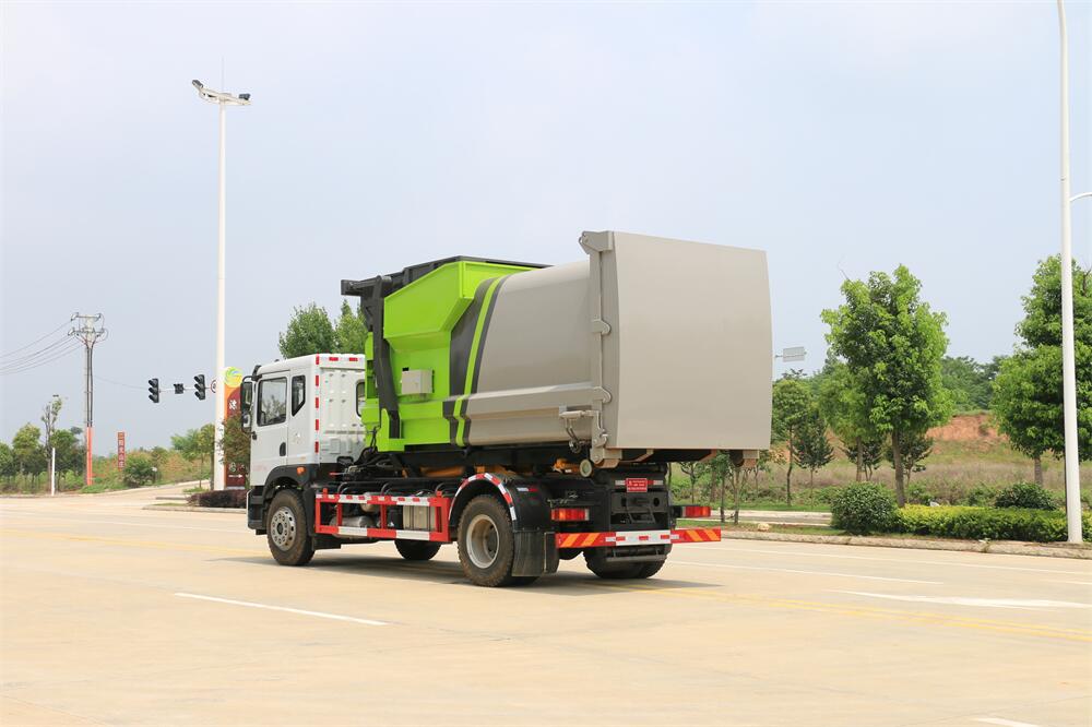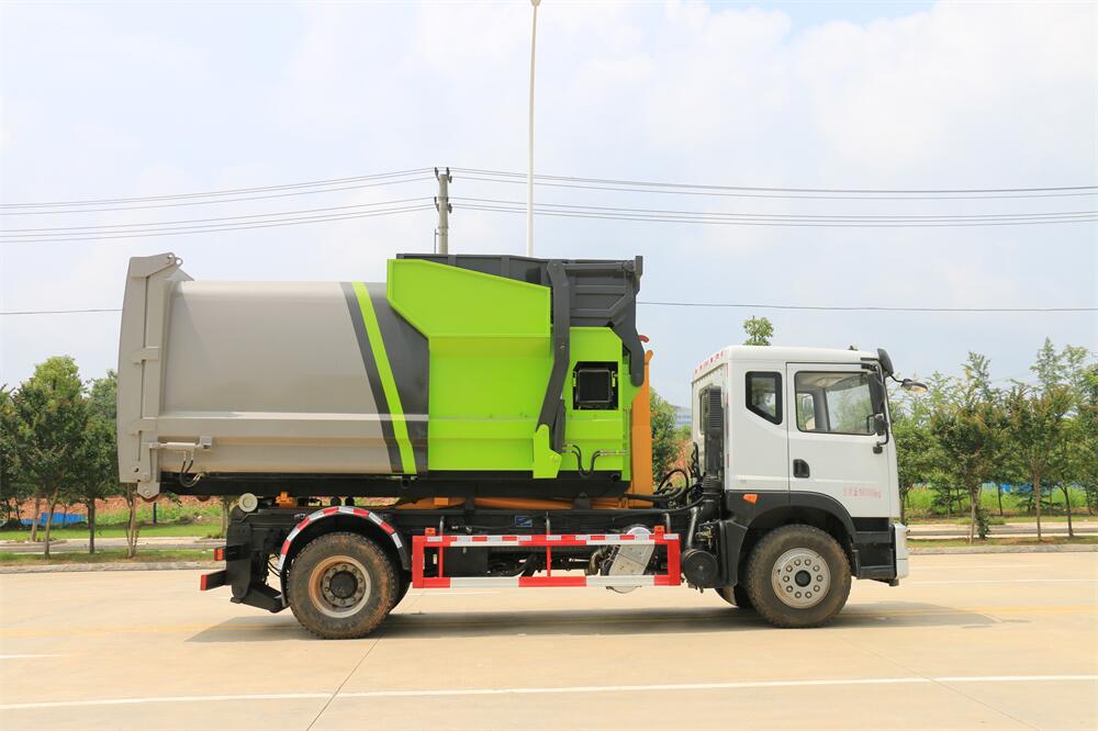該款鉤臂式垃圾車由液壓系統、操作系統組成。舉升油制缸(1支)系國內知名液壓件廠家生產的雙作用油缸。垃圾廂可自吊上放下,可自行傾倒垃圾,上下一次工作循環時間≤50S。該車的特點是一個車能配多個垃圾廂,能實現一臺車與多個垃圾廂聯合作業,循環運輸,充分提高了車輛的運輸能力。