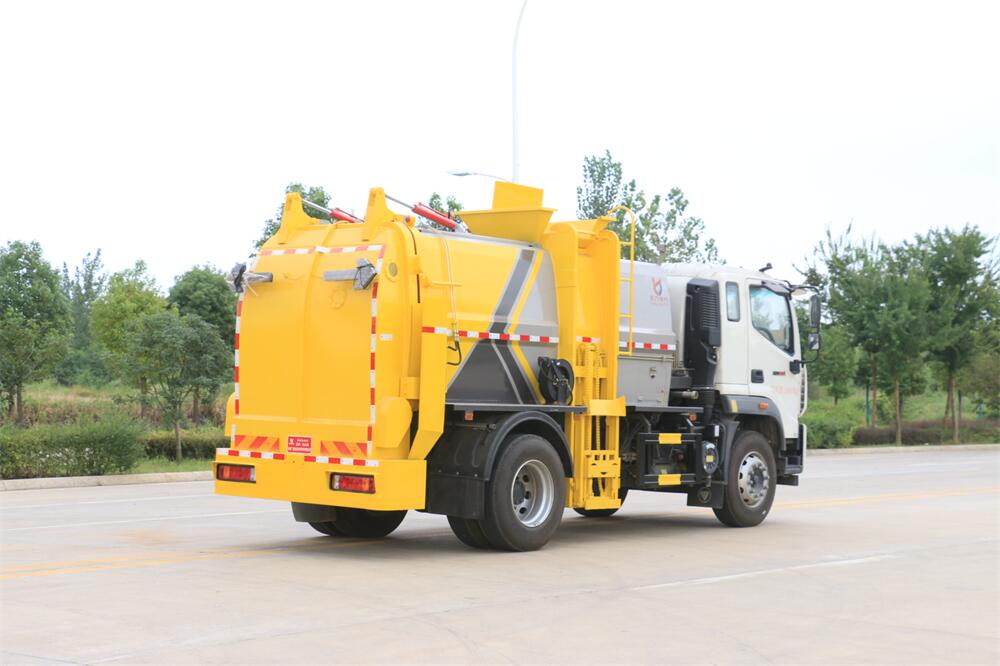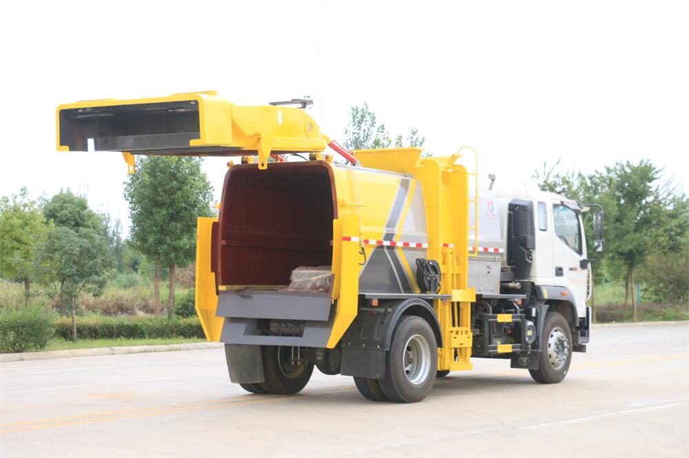 上裝配置:罐體容積10m3,配備120L/240L掛桶提升翻轉機構,液壓系統,后蓋液壓鎖緊開啟,罐體可以舉升自卸,尾部帶自流閥;用于運輸液態垃圾,其特點操作簡單,密封性好,無泄漏,無異味;可選裝固液分離功能,推板擠壓功能,常用于餐館的垃圾轉運處理。