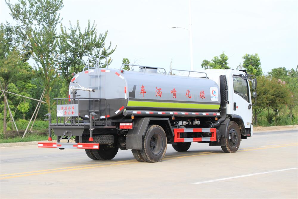 灑水車前裝有鴨形噴嘴或圓頭沖嘴,后面裝有圓柱開灑水噴嘴或蓮蓬頭噴嘴,后部有一工作平臺(tái),裝配有水炮。后部還可裝8個(gè)噴嘴(選裝)。