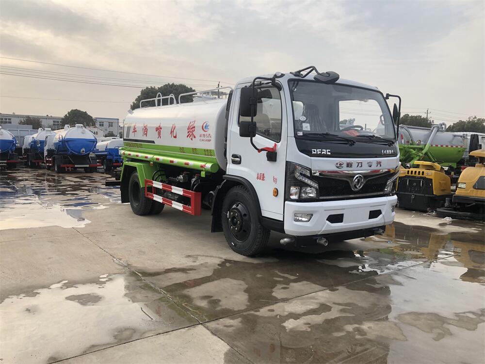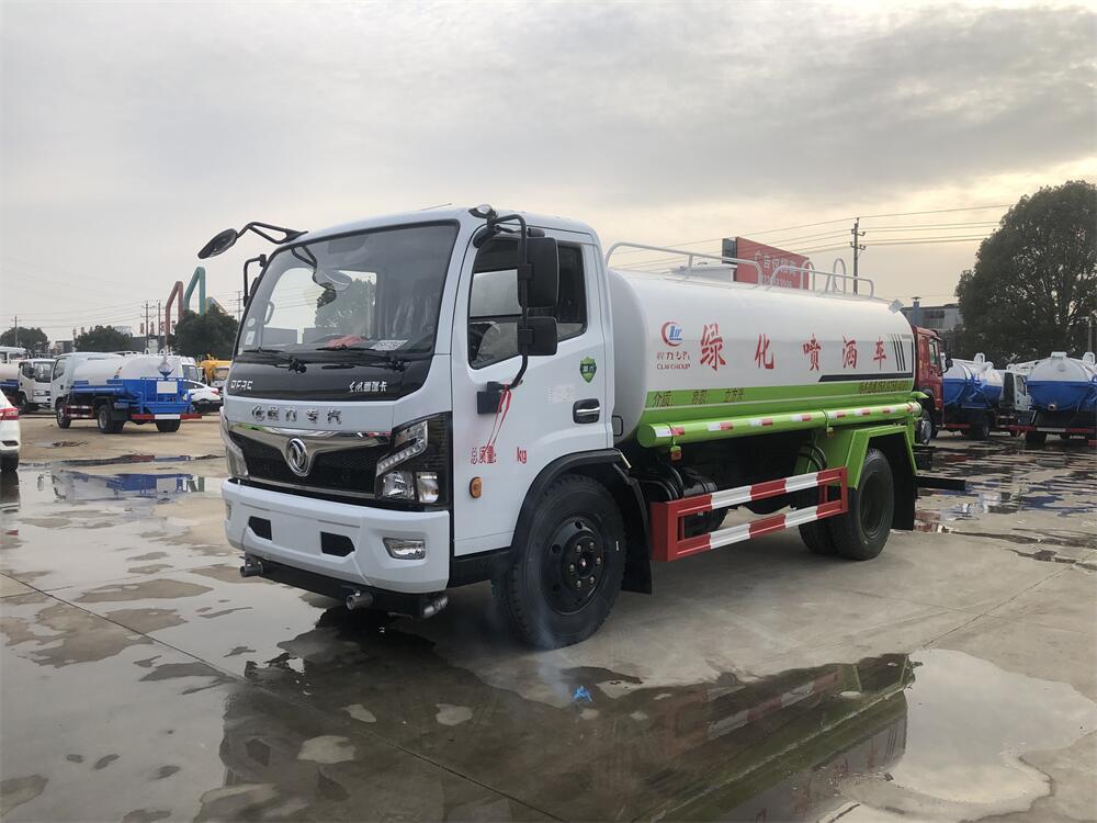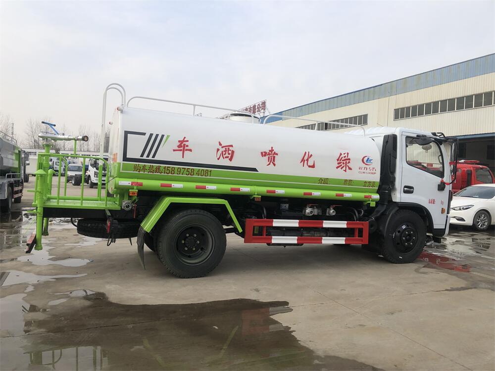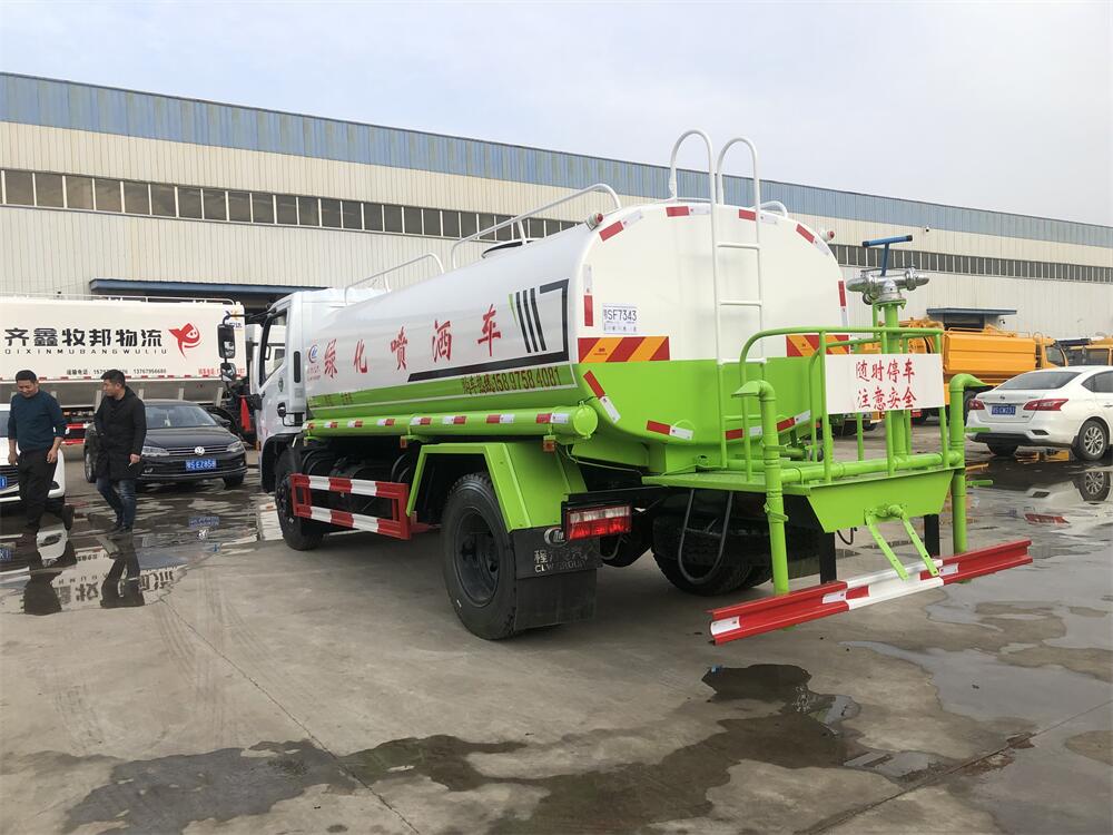 灑水車前裝有鴨形噴嘴或圓頭沖嘴,后面裝有圓柱開(kāi)灑水噴嘴或蓮蓬頭噴嘴,后部有一工作平臺(tái),裝配有水炮。后部還可裝8個(gè)噴嘴(選裝)。