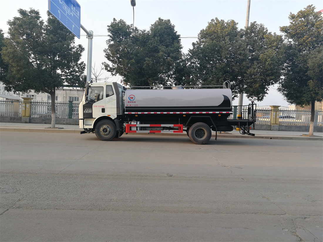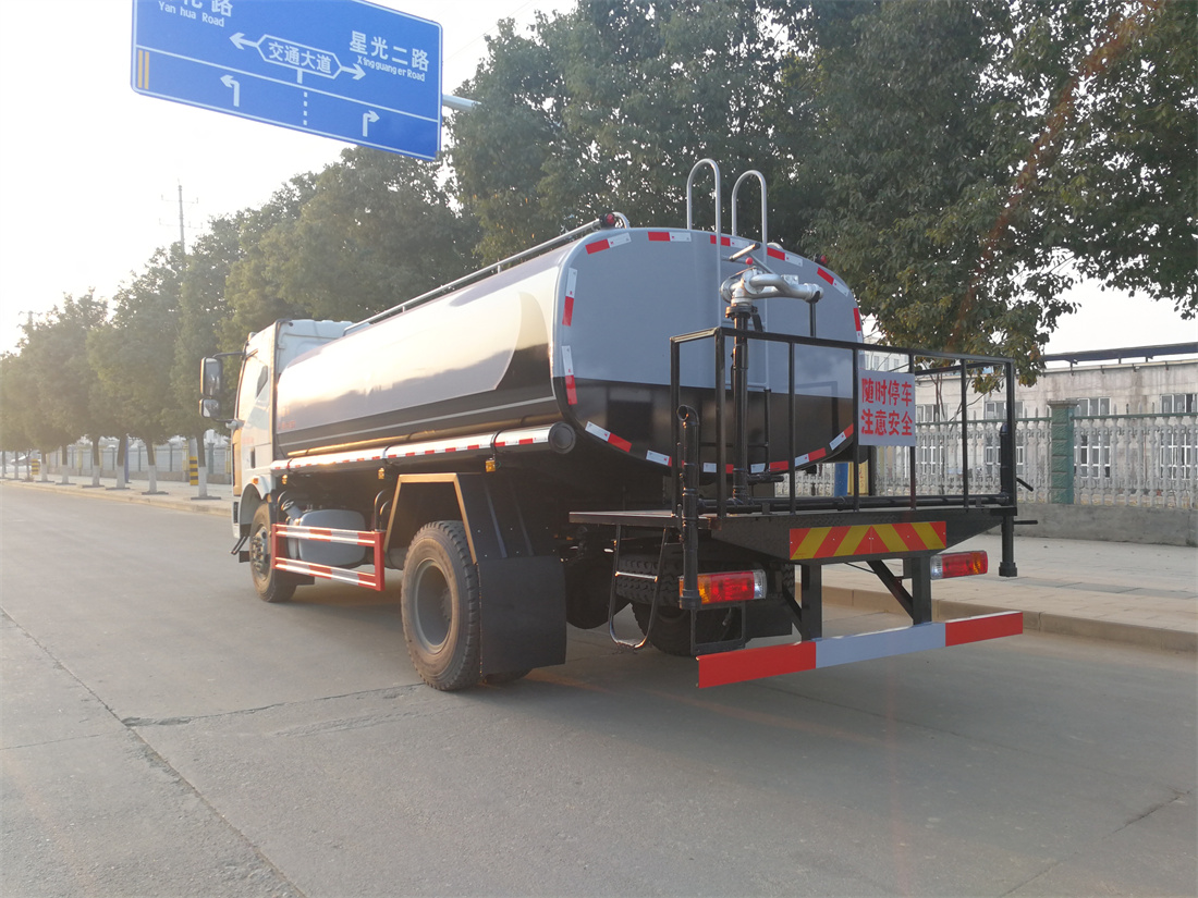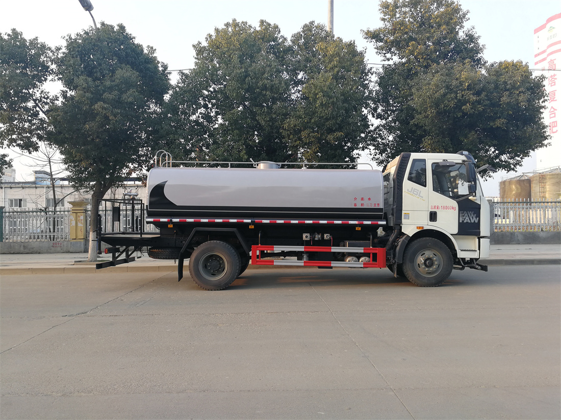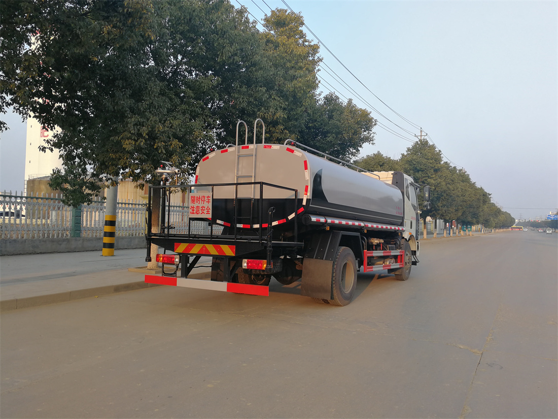 灑水車(chē)前裝有鴨形噴嘴或圓頭沖嘴,后面裝有圓柱開(kāi)灑水噴嘴或蓮蓬頭噴嘴,后部有一工作平臺(tái),裝配有水炮。后部還可裝8個(gè)噴嘴(選裝)。