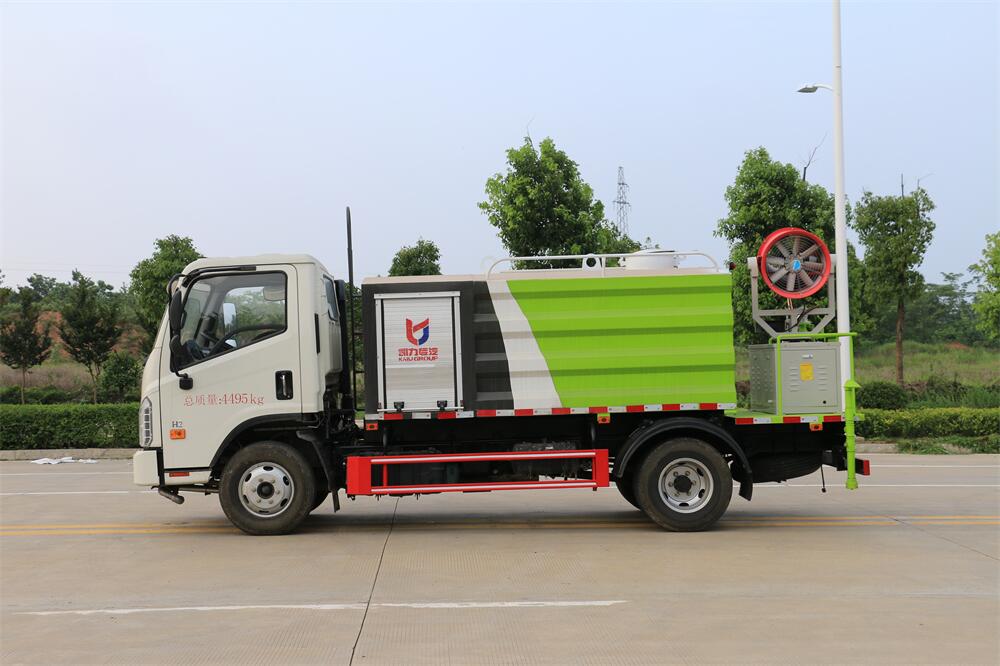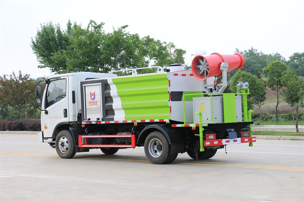 上裝配置:罐體容積為 5立方,選配風(fēng)送式霧炮機(jī)組射程30米、40米、50米、60米、80米、100米、120米霧炮,罐體鋼板為4mm碳鋼Q235材質(zhì),罐內(nèi)隔板具有防波作用,以減輕汽車行駛時(shí)罐體液體沖擊,罐體及整車外形尺寸按照公告。帶大功率專用灑水泵,泵可自吸自排,整車前沖、后灑、側(cè)噴、帶65消防接口,后平臺(tái)配CLW-50、CLW-60、CLW-80、CLW-100、CLW-120型風(fēng)送式霧炮機(jī)組;罐體前封頭配大功率柴油發(fā)電機(jī)組;前封頭帶水位計(jì),后平臺(tái)主管路帶1寸澆花接口,后爬梯。帶兩根輸水管及陰陽(yáng)端。罐體顏色:銀/灰/綠,罐體兩側(cè)噴“多功能抑塵車”字樣,貼反光標(biāo)示。