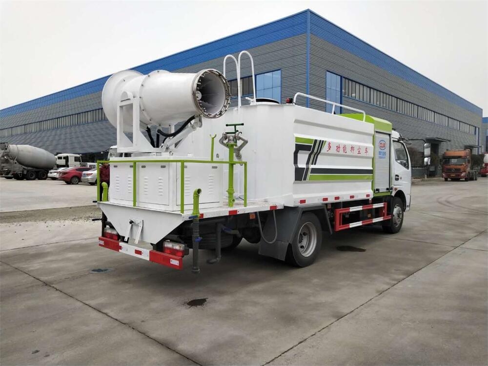 上裝配置:罐體容積為 8立方,選配風送式霧炮機組射程30米、40米、50米、60米、80米、100米、120米霧炮,罐體鋼板為4mm碳鋼Q235材質,罐內隔板具有防波作用,以減輕汽車行駛時罐體液體沖擊,罐體及整車外形尺寸按照公告。帶大功率專用灑水泵,泵可自吸自排,整車前沖、后灑、側噴、帶65消防接口,后平臺配CLW-50、CLW-60、CLW-80、CLW-100、CLW-120型風送式霧炮機組;罐體前封頭配大功率柴油發電機組;前封頭帶水位計,后平臺主管路帶1寸澆花接口,后爬梯。帶兩根輸水管及陰陽端。罐體顏色:銀/灰/綠,罐體兩側噴“多功能抑塵車”字樣,貼反光標示。