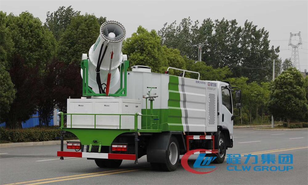 上裝配置:罐體容積為 8立方,選配風送式霧炮機組射程30米、40米、50米、60米、80米、100米、120米霧炮,罐體鋼板為4mm碳鋼Q235材質(zhì),罐內(nèi)隔板具有防波作用,以減輕汽車行駛時罐體液體沖擊,罐體及整車外形尺寸按照公告。帶大功率專用灑水泵,泵可自吸自排,整車前沖、后灑、側(cè)噴、帶65消防接口,后平臺配CLW-50、CLW-60、CLW-80、CLW-100、CLW-120型風送式霧炮機組;罐體前封頭配大功率柴油發(fā)電機組;前封頭帶水位計,后平臺主管路帶1寸澆花接口,后爬梯。帶兩根輸水管及陰陽端。罐體顏色:銀/灰/綠,罐體兩側(cè)噴“多功能抑塵車”字樣,貼反光標示。