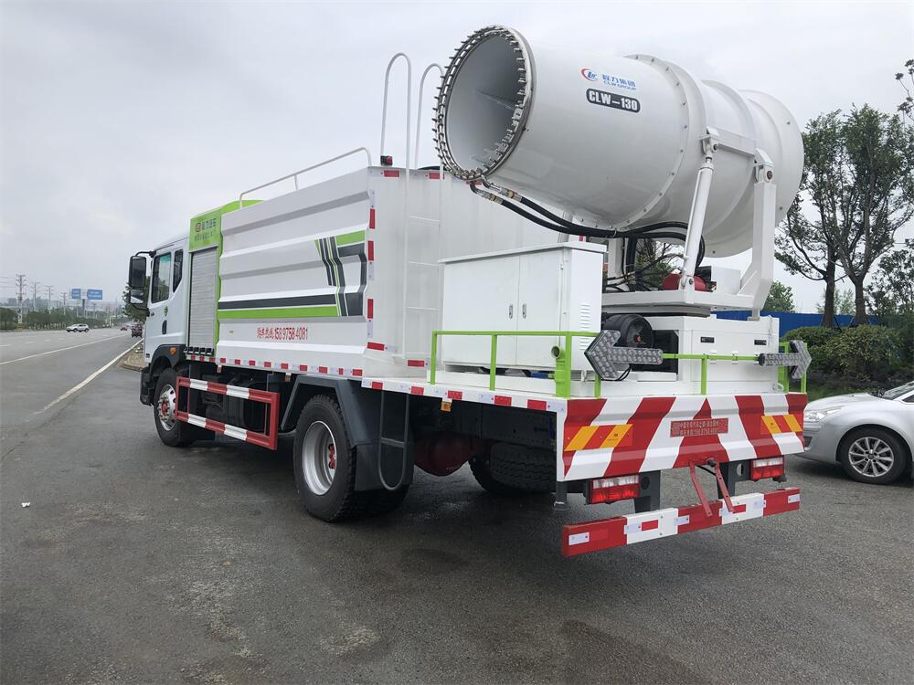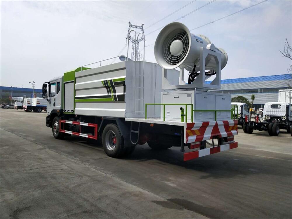 上裝配置:罐體容積為 12立方,選配風(fēng)送式霧炮機組射程30米、40米、50米、60米、80米、100米、120米霧炮,罐體鋼板為4mm碳鋼Q235材質(zhì),罐內(nèi)隔板具有防波作用,以減輕汽車行駛時罐體液體沖擊,罐體及整車外形尺寸按照公告。帶大功率專用灑水泵,泵可自吸自排,整車前沖、后灑、側(cè)噴、帶65消防接口,后平臺配CLW-50、CLW-60、CLW-80、CLW-100、CLW-120型風(fēng)送式霧炮機組;罐體前封頭配大功率柴油發(fā)電機組;前封頭帶水位計,后平臺主管路帶1寸澆花接口,后爬梯。帶兩根輸水管及陰陽端。罐體顏色:銀/灰/綠,罐體兩側(cè)噴“多功能抑塵車”字樣,貼反光標示。
