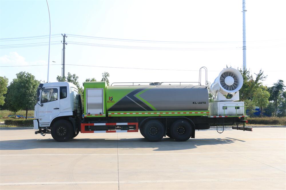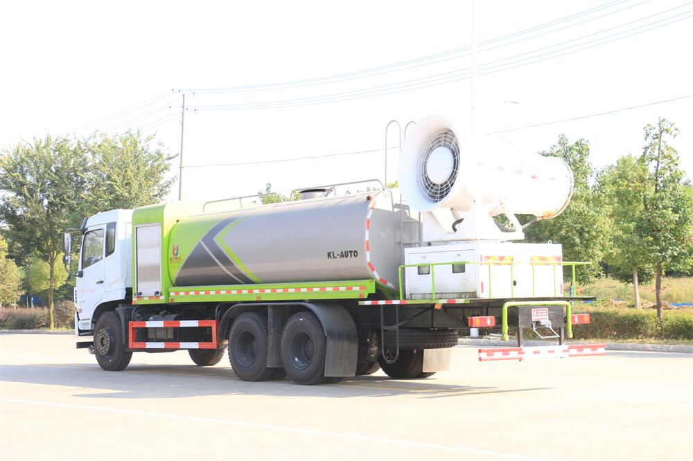 上裝配置:罐體容積為 16立方,選配風(fēng)送式霧炮機組射程30米、40米、50米、60米、80米、100米、120米霧炮,罐體鋼板為4mm碳鋼Q235材質(zhì),罐內(nèi)隔板具有防波作用,以減輕汽車行駛時罐體液體沖擊,罐體及整車外形尺寸按照公告。帶大功率專用灑水泵,泵可自吸自排,整車前沖、后灑、側(cè)噴、帶65消防接口,后平臺配CLW-50、CLW-60、CLW-80、CLW-100、CLW-120型風(fēng)送式霧炮機組;罐體前封頭配大功率柴油發(fā)電機組;前封頭帶水位計,后平臺主管路帶1寸澆花接口,后爬梯。帶兩根輸水管及陰陽端。罐體顏色:銀/灰/綠,罐體兩側(cè)噴“多功能抑塵車”字樣,貼反光標示。